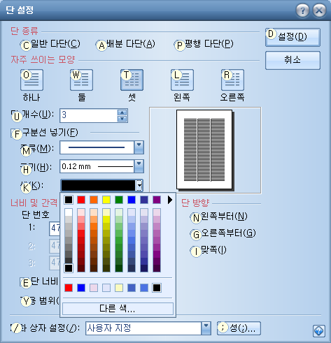 단 설정 창이 띄어진 모습입니다. 단 설정 창의 자주 쓰이는 모양 항목을 봐주시기 바랍니다. 하나, 둘, 셋, 왼쪽, 오른쪽 등 다섯 개의 항목이 있습니다. 하나는 말 그대로 한 페이지 그대로 작업하는 것, 둘은 페이지를 두 영역으로 나누어 작업하는 것, 셋은 페이지를 세 영역으로 나누어 작업하는 것을 말합니다.