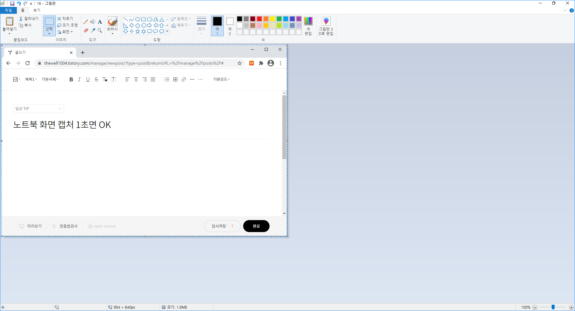 그림판이 정상적으로 실행되었다면, 키보드 단축키 Ctrl + V를 눌러주어 노트북 화면 캡처한 이미지를 붙여 넣기 합니다.