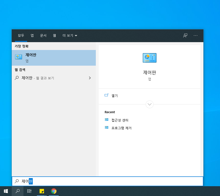 컴퓨터 하단의 작업 표시줄을 보시면 돋보기 모양 아이콘(검색)이 있을 텐데, 해당 아이콘을 클릭해주신 후 '제어판'이라고 입력해주시면 쉽게 제어판을 실행시킬 수 있어요.