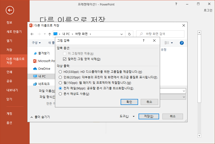 용량을 줄여 저장한 프레젠테이션의 퀄리티가 너무 좋지 않게 느껴진다면 숫자를 살짝 올려 저장하시는 것도 좋은 방법입니다.