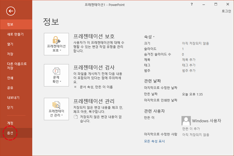 파일 탭을 클릭해주시면 실행한 프레젠테이션의 정보들이 보입니다. 그리고 왼쪽을 봐주시면 새로 만들기, 열기, 저장, 다른 이름으로 저장, 인쇄, 공유, 내보내기, 닫기, 계정, 옵션 등이 있습니다. 가장 하단에 있는 옵션을 클릭합니다.