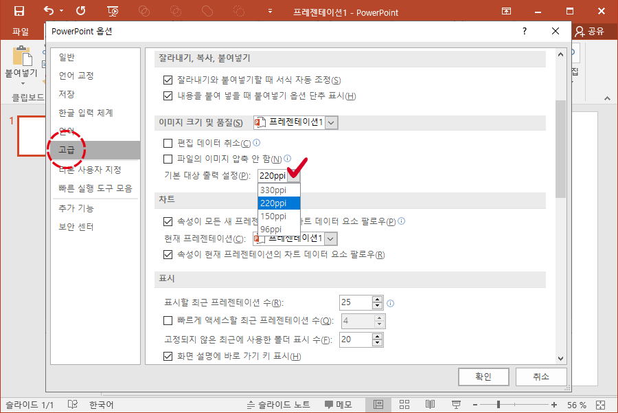 이미지 크기 및 품질 항목을 봐주시면 기본 대상 출력 설정이 보이실 텐데요. 해당 부분을 클릭하여 출력 설정 값을 변경해주시면 되겠습니다. 숫자가 높을수록 프레젠테이션의 퀄리티가 좋아짐과 동시에 용량이 크고, 숫자가 낮을수록 퀄리티가 낮아짐과 동시에 용량이 줄어듭니다.