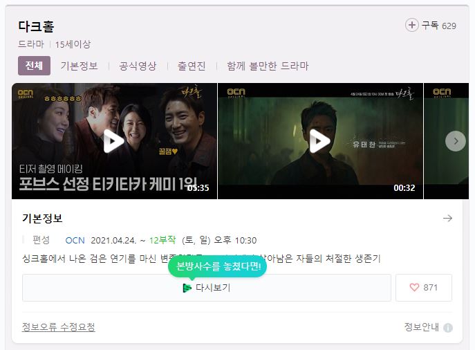 요즘은 스위트홈, 킹덤과 같은 좀비물이 많은 인기를 끌고 있는데요. OCN 다크홀도 그 인기를 이어갈 수 있을지 궁금합니다. OCN 다크홀이 궁금하신 분들은 2021년 4월 24일 토요일 10시 30분 OCN을 통해 직접 확인해보시기 바랍니다.
