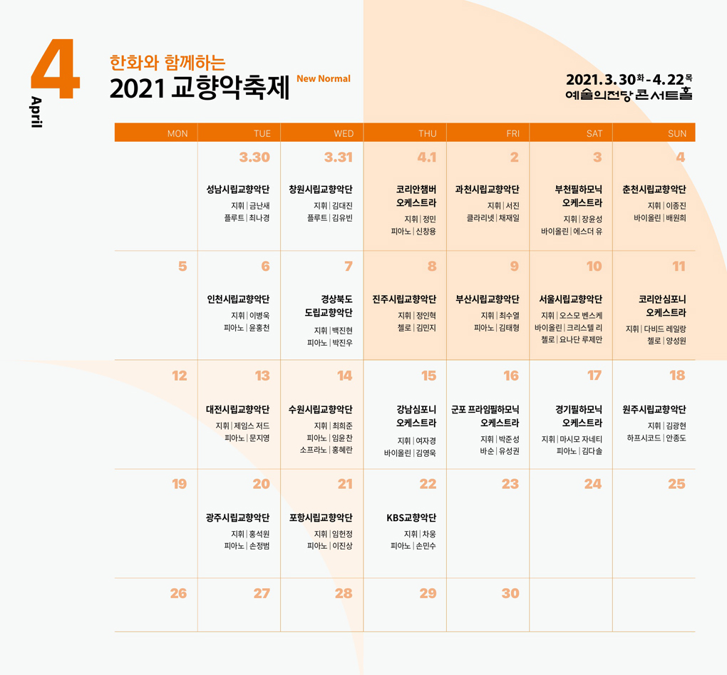 한화와 함께하는 2021 교향악축제 정보입니다. 교향악축제는 3월 31일부터 진행되고 있는 공연인데요. 코로나 19의 유행으로 인해 대면과 비대면 두 가지 방식으로 진행됩니다. 2021 교향악축제의 모든 공연들은 네이버 공연 라이브와 KBS 클래식 FM에서 실시간으로 감상이 가능하니 참고해주시기 바랍니다.