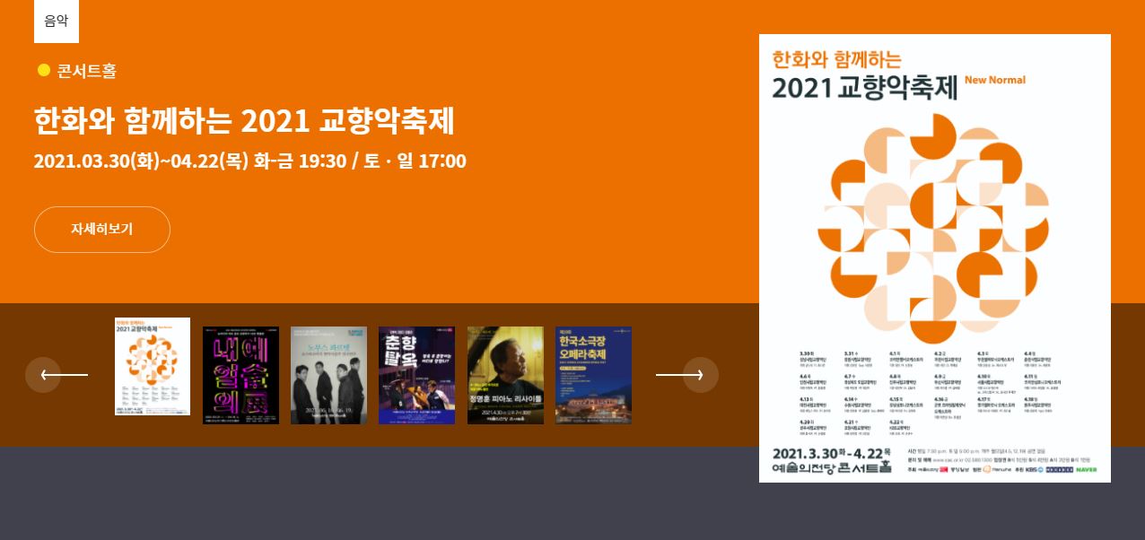 2021 교향악 축제 공연은 평일 오후 7시 30분, 토·일요일 오후 5시에 진행됩니다. (월요일은 공연이 진행되지 않습니다.)