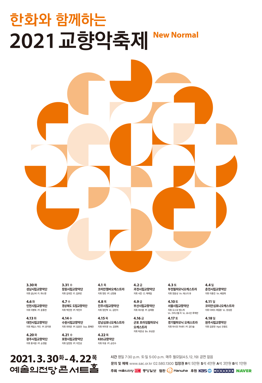 한화와 함께하는 2021 교향악축제 정보입니다. 교향악축제는 3월 31일부터 진행되고 있는 공연인데요. 코로나 19의 유행으로 인해 대면과 비대면 두 가지 방식으로 진행됩니다. 2021 교향악축제의 모든 공연들은 네이버 공연 라이브와 KBS 클래식 FM에서 실시간으로 감상이 가능하니 참고해주시기 바랍니다.