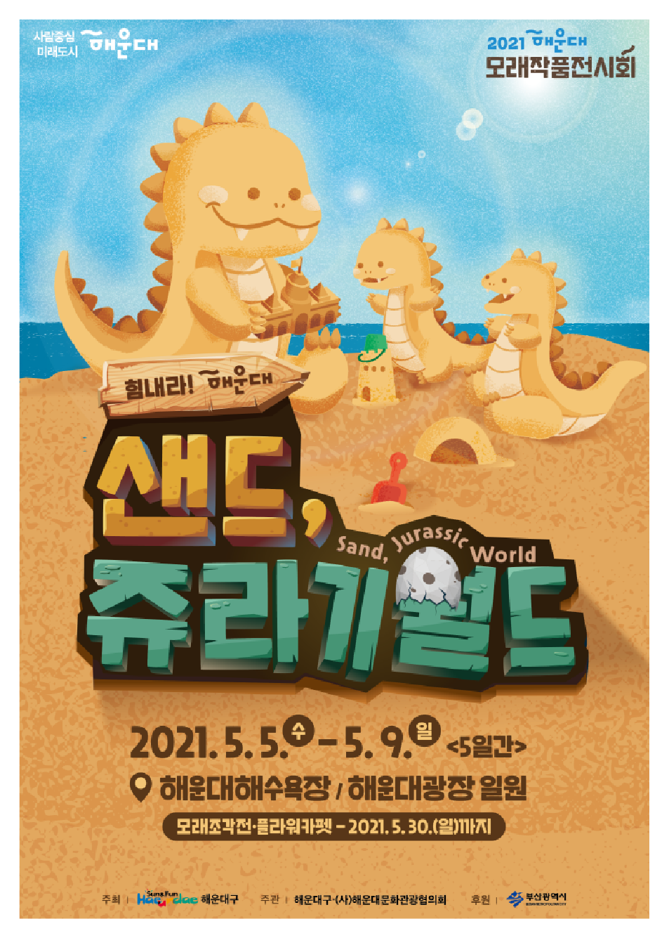 해운대 모래작품 전시회의 이름은 '샌드, 쥬라기 월드'로, 세계 유일의 모래를 소재로 한 친환경 테마 전시회이기 때문에 많은 기대를 불러오고 있습니다. 행사 자체는 5월 5일부터 5월 9일까지 5일 동안 진행되지만, 모래 작품 및 구남로 꽃 전시 기간은 5월 30일까지이니 참고해주시기 바랍니다.