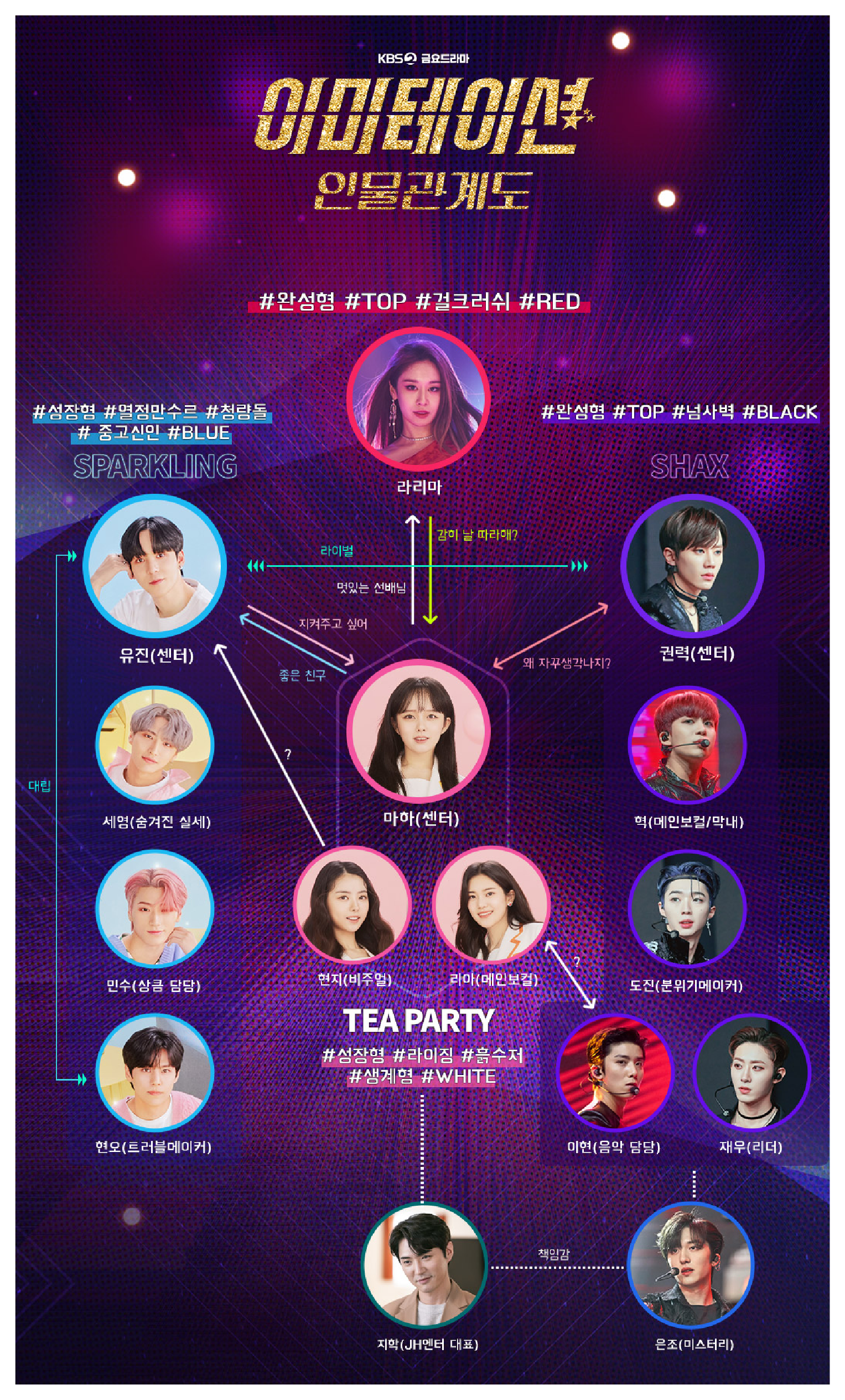 드라마 이미테이션에 나오는 아이돌 그룹에도 눈길이 갑니다. 밝혀진 바에 따르면 드라마 이미테이션에는 샥스, 티파티, 스파클링 등의 아이돌 그룹이 등장할 예정입니다.