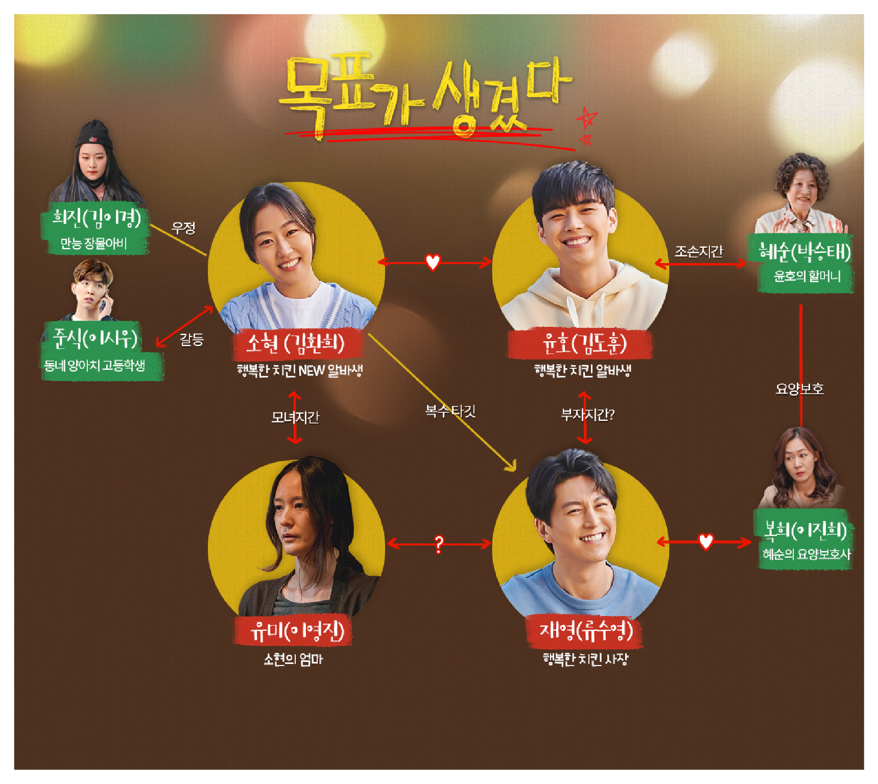 MBC 공식 홈페이지에서 볼수있는 '목표가 생겼다' 인물 관계도입니다. 홀어머니 밑에서 자란 소현은 고 1 때 자퇴한 후, 휴대폰 소매치기를 하며 사는 19살 소녀입니다. 그렇게 미래에 대한 희망도 없이 살던 소현은 우연히 죽은 줄 알았던 아빠의 존재를 알게 되는데요. 아빠를 보고 처음으로 복수해야겠다는 목표를 갖습니다.