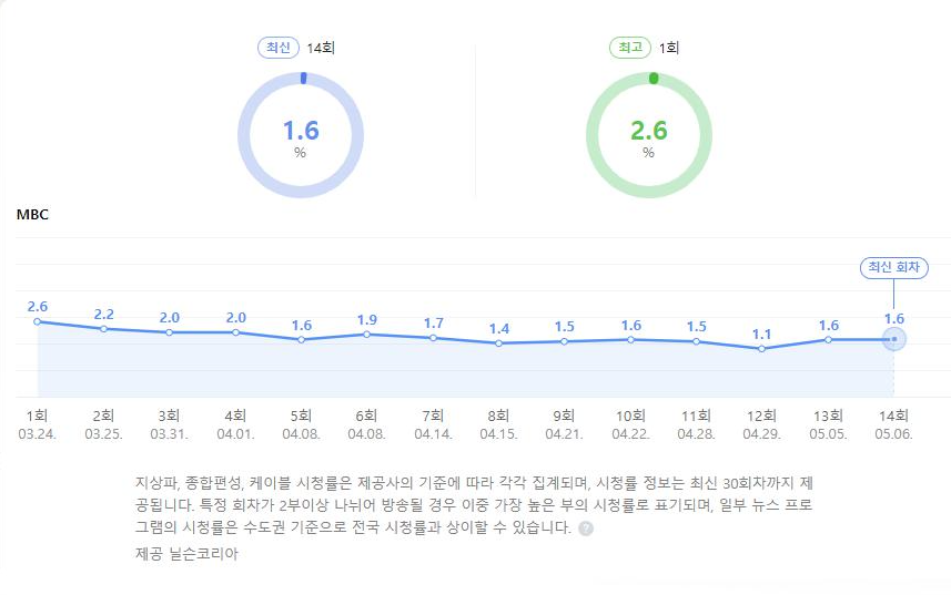 닐슨코리아 자료에 따르면, MBC 드라마 오 주인님 시청률은 최근 방영회차 기준 1.6%입니다. 최고 시청률은 1회로, 2.6%를 달성한 적이 있습니다. 1회부터 14회까지의 시청률을 살펴본 결과, 1회 2.6% / 2회 2.2% / 3회 2.0% / 4회 2.0% / 5회 1.6% / 6회 1.9% / 7회 1.7% / 8회 1.4% / 9회 1.5% / 10회 1.6% / 11회 1.5% / 12회 1.1% / 13회 1.6% / 14회 1.6%로 회차가 거듭될수록 시청률은 줄어든 추세입니다.