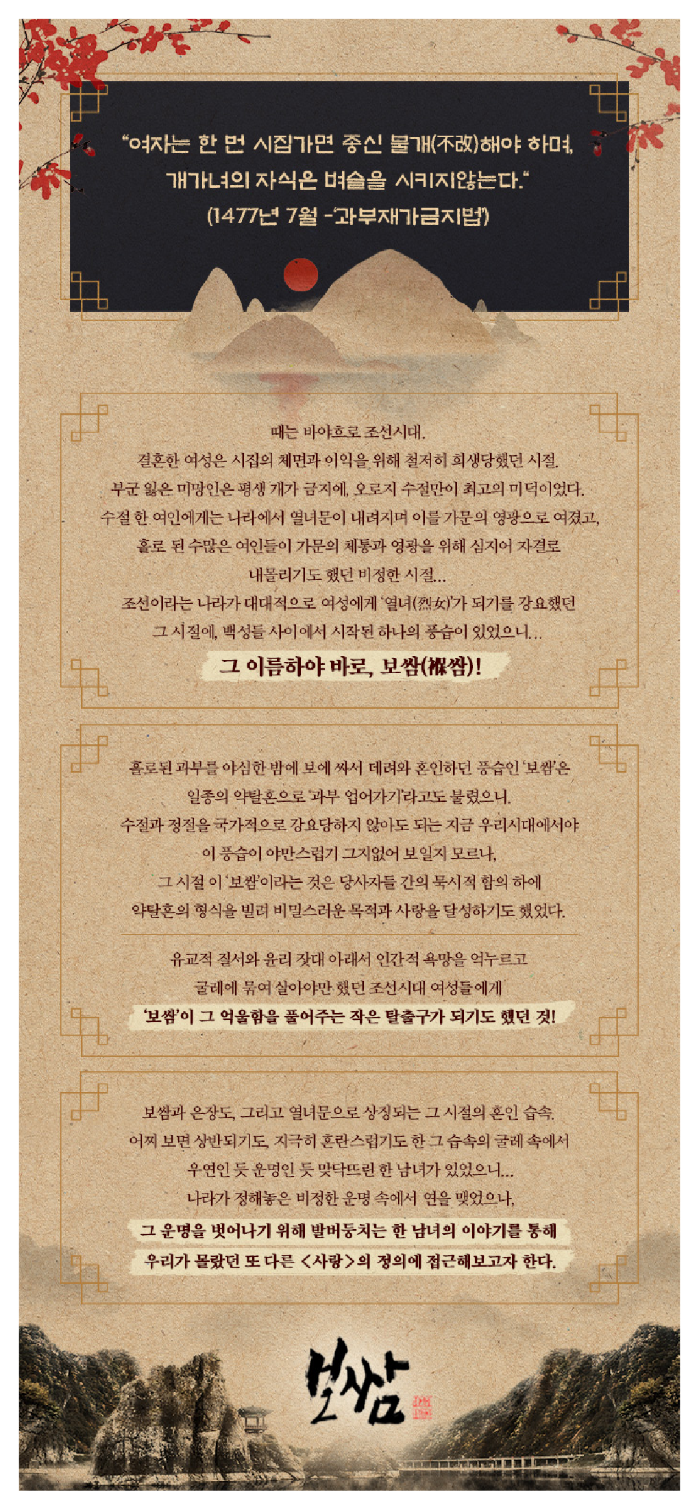 때는 조선시대, 결혼한 여성들은 철저히 희생당하던 시절. 과부가 된 여성들은 평생 개가 금지와 수절을 강요당했죠. 하지만 과부를 보에 싸서 데려와 혼인하던 혼인 풍습 '보쌈'을 통해 비밀스러운 사랑을 이어가는 사람들도 있었습니다. 그냥 보면 야만스러워 보이기도 하지만, 무작정 데려오는 것이 아닌 당사자들 간의 합의 하에 비밀스럽게 목적을 달성했던 것인데요. 나라가 정해놓은 비정한 운명 속에서 연을 맺었으나 그 운명을 벗어나기 위해 발버둥 치는 한 남녀의 이야기를 통해 우리가 몰랐던 또 다른 사랑의 정의에 접근해보고자 하는 것이 '보쌈-운명을 훔치다'의 기획 의도입니다.