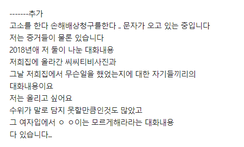 이후 추가된 내용입니다. 고소를 한다, 손해배상 청구를 한다 등의 문자가 오고 있는 중이라는 글쓴이는 2018년 당시 H군과 A양이 나눈 대화 내용, 둘이 글쓴이의 집에 올라간 씨씨티비 사진, 그날 글쓴이의 집에서 무슨 일을 했었는지 두 사람이 나눴던 대화 내용 등 증거들이 있다고 합니다. 그리고 그중에는 A양이 ㅇㅇ(아마도 글쓴이)는 모르게 해라 라고 말한 대화 내용도 있다고 하네요.