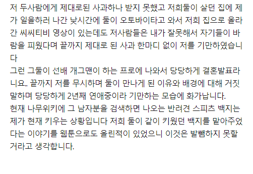 해당 글에 의하면, 두 사람은 글쓴이가 일을 하러 나간 뒤 오토바이를 타고 집으로 올라간 씨씨티비 영상이 있음에도 제대로 된 사과 한마디 없이 글쓴이를 기만하였다고 합니다. 그런 그 둘이 당당하게 결혼 발표를 하는 모습에 화가 난다는 글쓴이는 현재 개그맨 H군을 검색하면 나오는 반려견을 키우고 있는 상태라고 하네요. 해당 반려견은 A양의 웹툰에도 올라온 적이 있다고 합니다.
