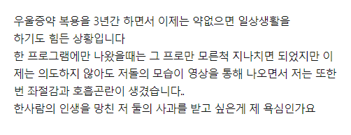 어느 날 갑자기 H군이 헤어지자고 했다는 글쓴이는 자신이 본가로 내려와 힘들어하고 있던 당시 보게 된 A양의 웹툰에 대한 이야기도 덧붙였는데요. 해당 웹툰은 H군과 자신이 함께 살던 시기, H군과 A양이 함께 낚시 여행을 다녀왔던 내용이었으며 그 뒤로 자신은 3년째 우울증 약을 복용 중이라고 밝혔습니다.