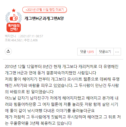 해당 글을 작성한 사람(이하 글쓴이)은 개그맨 H군과 연애 동거 결혼 약속까지 했던 사람이며, 개그맨 H군은 자신과 헤어지기 전부터 모 사이트 웹툰으로 데뷔해 유명해진 A 작가와 바람을 피우고 있었다고 주장했습니다.