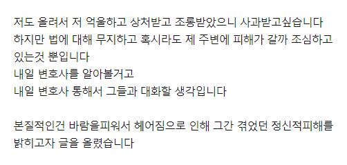 이어 글쓴이는 바람으로 인해 받은 정신적 피해를 밝히고자 글을 올렸으며, 변호사를 통해 그들과 대화할 생각이라고 밝혔습니다.