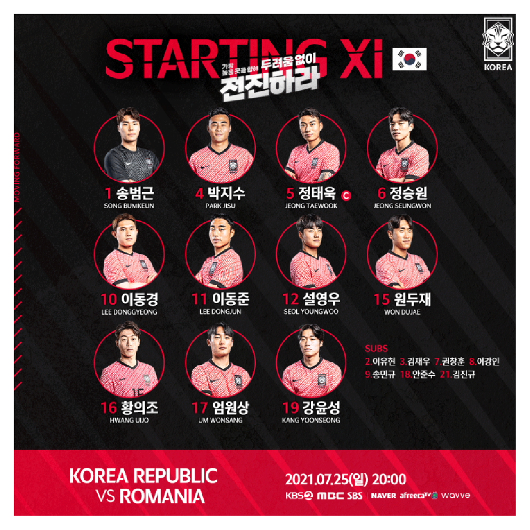 | 7월 25일 일요일 20시 | 대한민국 (승) | 4 | 0 | 루마니아 |