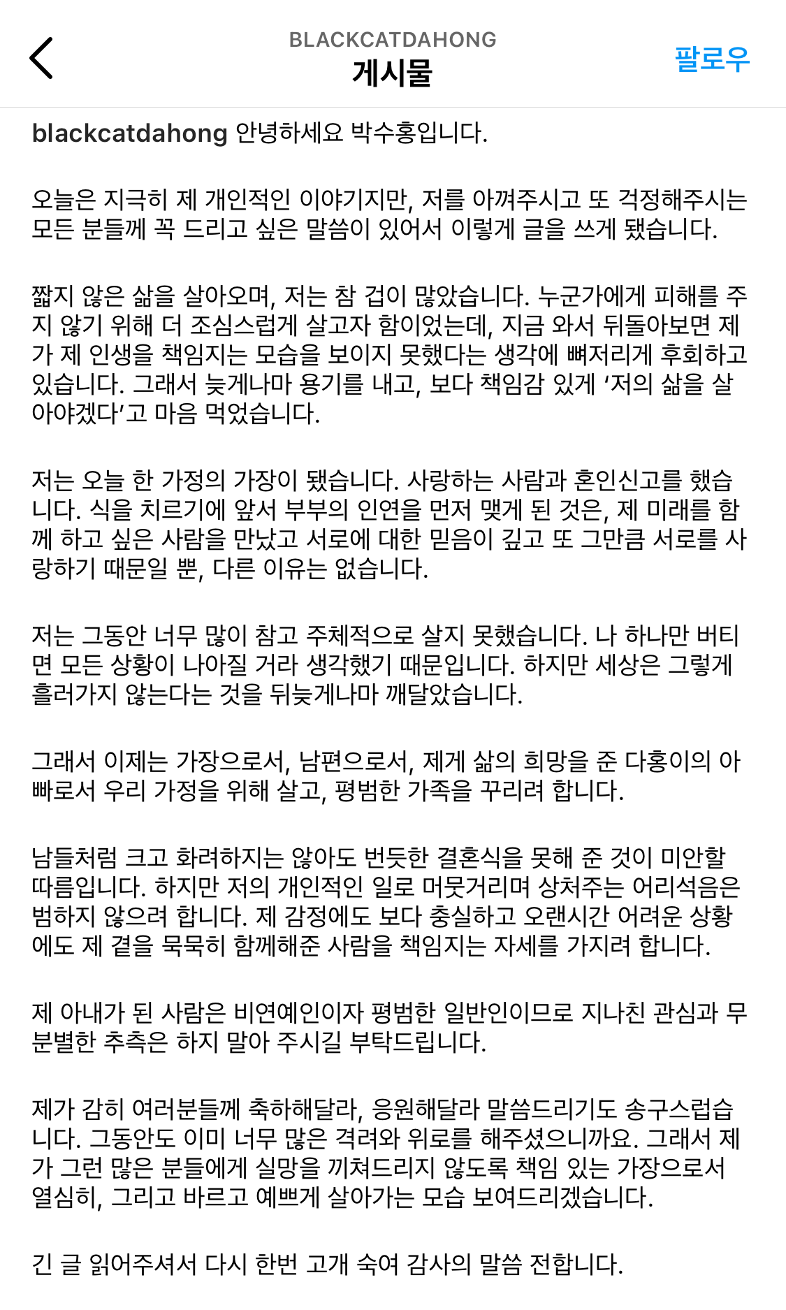 그동안 너무 많이 참고 주체적으로 살지 못했다는 박수홍은 이제부터 가장으로서, 남편으로서, 자신에게 삶의 희망을 준 다홍이의 아빠로서 가정을 위해 살고, 평범한 가족을 꾸리려 한다고 합니다. 그러면서도 아내가 된 사람은 비연예인이자 평범한 일반인이므로 지나친 관심과 무분별한 추측은 하지 말아 달라고 당부했습니다.