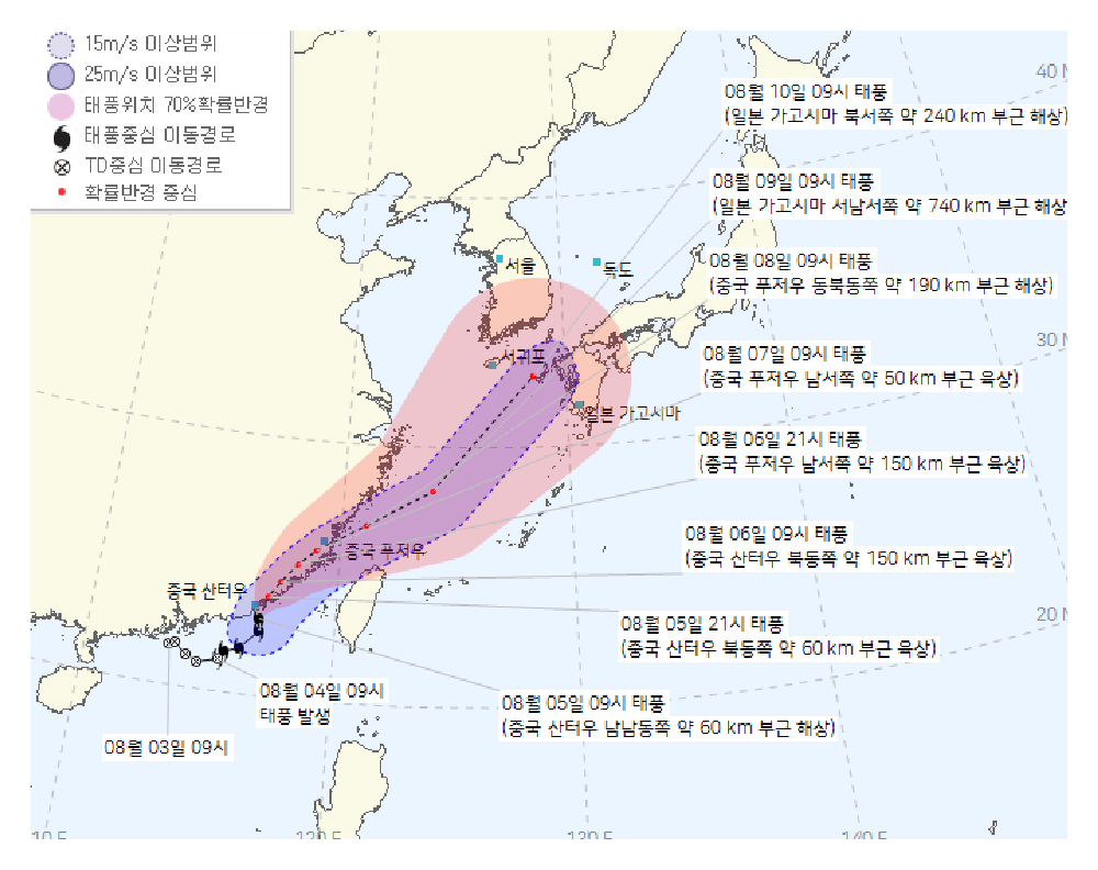 저녁쯤 산터우 북동쪽 육상에 상륙했다가, 8일 오전쯤 다시 해상으로 빠져나와 일본 방향으로 이동할 것으로 예상된다고 해요. 그리고 이 과정에서 우리나라와 일본 사이를 지나가게 되고, 이때 우리나라에도 영향을 줄 가능성이 있습니다.