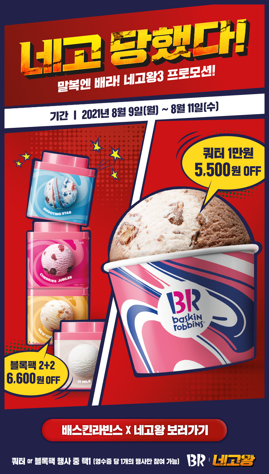 배스킨 라빈스는 네고왕과의 네고 끝에 2021년 8월 9일 월요일부터 8월 11일 수요일까지 행사를 진행하기로 했습니다. 행사 내용은 15,500원에 판매하는 쿼터를 5,500원 할인한 금액인 10,000원에 판매하는 것입니다.