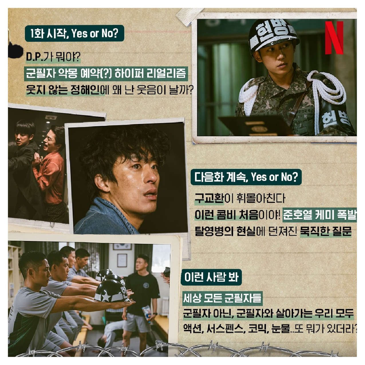 "나쁜 건 시스템이었을까, 인간일까" 탈영병 잡는 군인 듀오 준호와 호열, 군을 이탈해야만 했던 청춘들의 고뇌와 절박하고 유쾌한 D.P.식 질주를 잘 보여주었다고 해요.