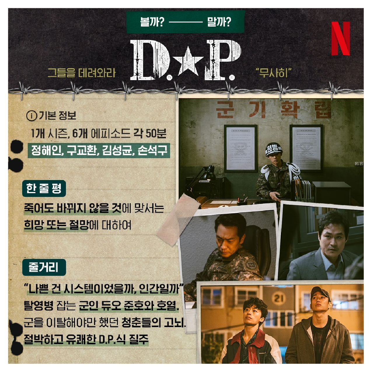 지난 8월 27일, 넷플릭스를 통해 드라마 <D.P.>가 공개되었습니다. <D.P.>는 탈영병들을 잡는 근무 이탈 체포조(D.P.) 준호와 호열이 다양한 사연을 가진 이들을 쫓으며 미처 알지 못했던 현실을 마주하는 이야기를 다룬 웹드라마인데요. 지금까지 공개된 바로는 1개 시즌으로, 각 50분씩 총 6부작 구성입니다.