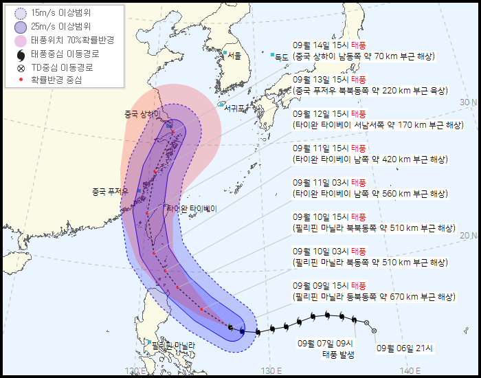 09월 14일 15시 태풍 - 중국 상하이 남동쪽 약 70km 부근 해상