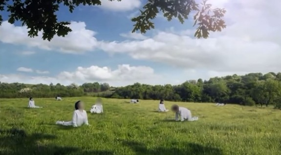 남성의 나레이션이 나온 후에는 긴 생머리를 하고 흰 옷을 입은 여성이 시냇가의 물을 떠마시고, 나뭇잎에서 흐르는 물을 마시는 장면이 나오는데요. 이어서 머리를 묶은 여성과 파마를 한 남성 등 여러 명이 모여 요가를 하는 장면으로 전환됩니다. 그리고 카메라를 든 남성이 이들의 모습을 촬영하기 위해 다가가는데, 다가가면서 나뭇잎을 밟게 되고 그 소리를 들은 사람들은 모두 젖소로 바뀌면서 끝이 납니다.