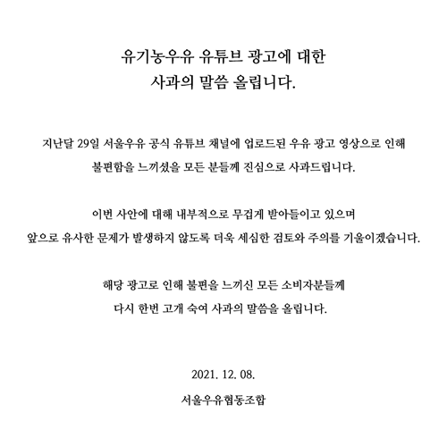 서울우유 영상에 대한 논란이 계속해서 커지자, 이를 인지한 서울우유 측에서는 어제인 8일 공식 유튜브 채널에서 해당 광고를 삭제했습니다. 이어서 공식 홈페이지에 사과문을 게시하였습니다. 서울우유 관계자는 '청정 자연과 친환경을 강조하려는 목적이었으며 여성을 비하할 의도는 없었다, 재발 방지를 위해 더욱 주의를 기울이겠다'고 해명했습니다. 하지만 소비자들의 반응은 아직 싸늘합니다.