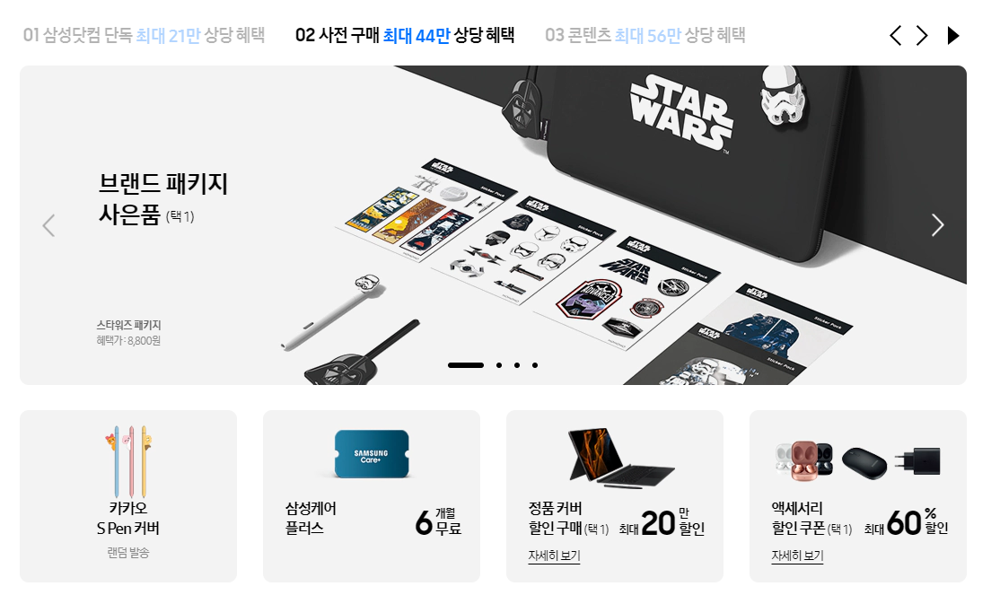 갤럭시탭 S+8 사전예약을 통해 갤럭시탭 S+8을 구매하는 경우 스타워즈 패키지와 카카오 S Pen 커버를 받을 수 있습니다. 또한 삼성 케어 플러스 서비스를 6개월 동안 무료로 이용할 수 있고, 정품 커버도 최대 20만 원 까지 할인된 금액으로 구매가 가능합니다. 또한 최대 60%까지 할인되는 액세서리 할인 쿠폰도 받을 수 있는데, 정품커버 할인 구매와 액세서리 할인 구매는 둘 중 하나의 혜택만 받을 수 있습니다.