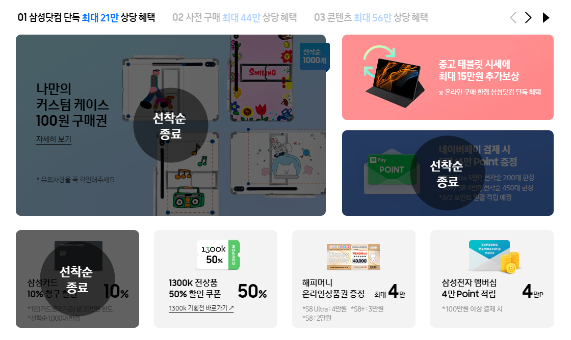 갤럭시탭S+8갤럭시탭 S+8 사전예약 혜택입니다. 삼성닷컴 단독 최대 21만 상당 혜택, 사전 구매 최대 44만 상당 혜택, 콘텐츠 최대 56만 상당 혜택 등이 있는데요. 아쉽게도 벌써 선착순 종료된 혜택들이 몇몇 보이네요. 갤럭시탭 S+8 사전예약에 관심 있으신 분들은 더 이상 시간을 지체하기보다 조금이라도 더 빨리 신청하시는 것이 좋을 것 같습니다. 그래도 아직 해피머니 온라인 상품권 증정, 삼성전자 멤버십 4만 포인트 적립 등 꽤 눈길이 가는 혜택들이 남아있네요.