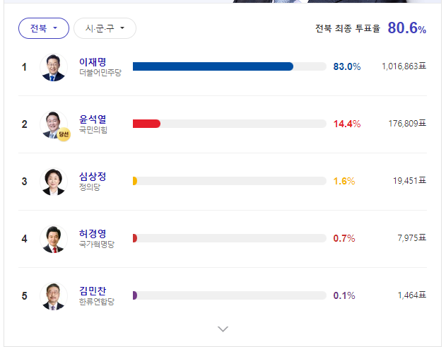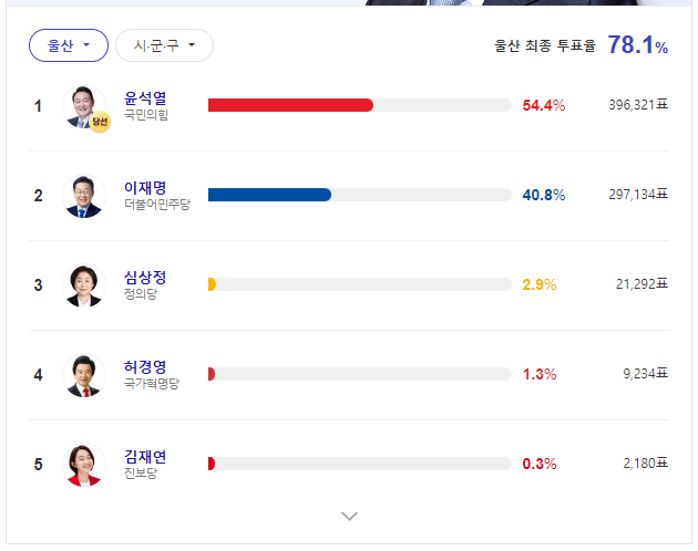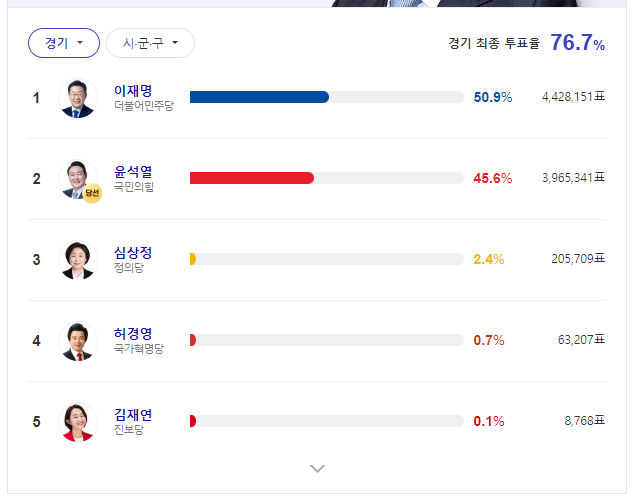 바로 어제 진행된 2022년 제20대 대통령 선거에서 기호 2번이었던 윤석열 당선인이 득표율 48.6%로 1위에 올랐습니다. 그리고 기호 1번 이재명 후보는 득표율 47.8%로 2위에 머물렀는데요. 윤석열 당선인은 총 16,394,815표, 이재명 후보는 총 16,147,738표로 겨우 247,077표 차이밖에 나지 않았습니다.