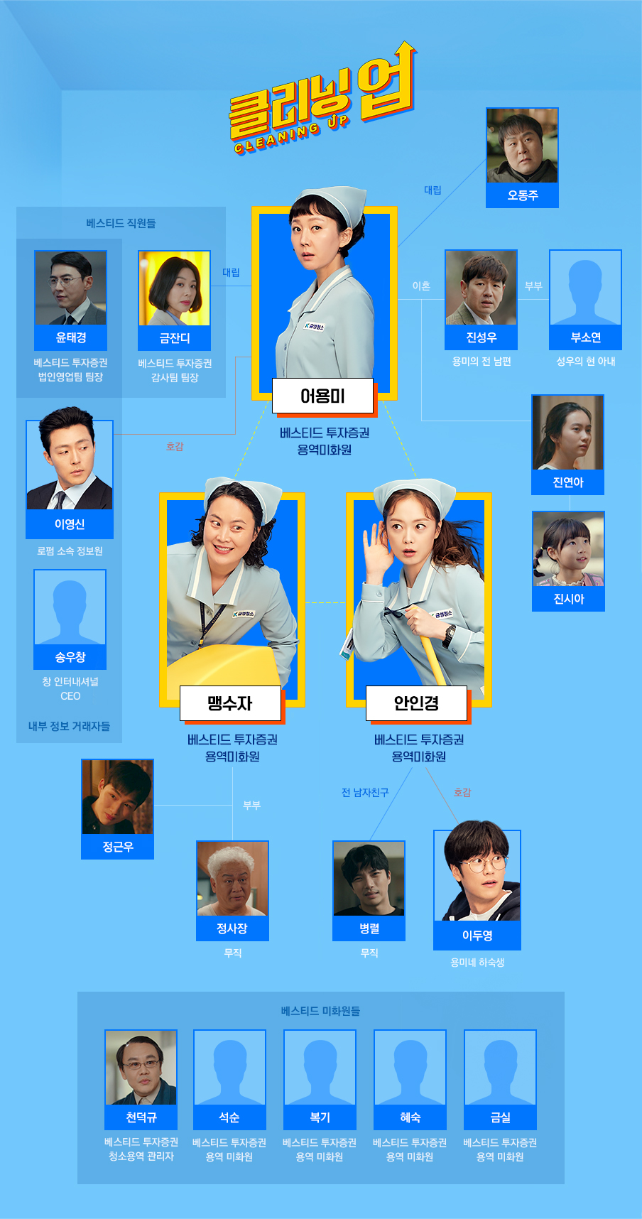 드라마 클리닝 업은 청소부들이 주식 내부자 거래를 통해 거액을 버는 여성 케이퍼 물입니다. 보통 여의도 고층 빌딩에는 고학력, 고소득, 고스펙의 화이트칼라만 있다고 생각하겠지만 그렇지 않습니다. 건물 곳곳을 프리패스하며 직원들의 취향과 사생활까지 꿰고 있지만 그 누구도 경계하지 않는 하청 청소부들이 있기 때문입니다.