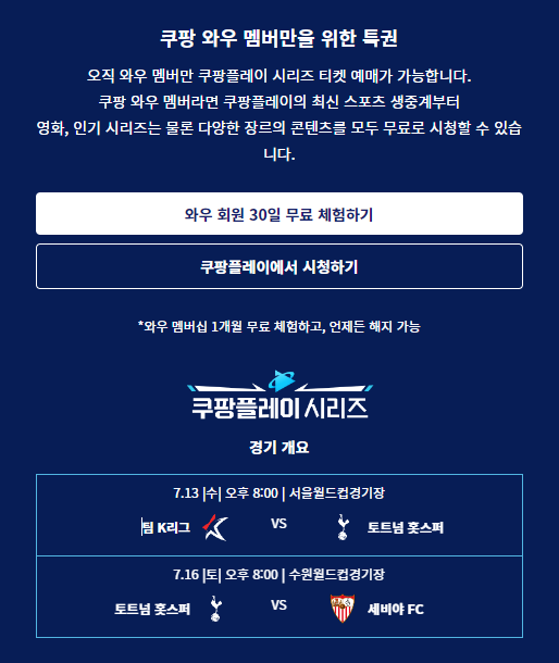 아쉽게도 이번 토트넘 내한 경기는 쿠팡플레이가 독점 중계하기 때문에, TV나 다른 OTT 서비스에서는 시청이 불가하다고 해요. 쿠팡 플레이는 평소에 쿠팡 로켓 와우를 이용하시는 분들만 이용이 가능한 OTT 서비스인데, 아직 한 번도 로켓 와우를 이용해 보지 않으신 분이라면 30일 무료 체험이 가능합니다.