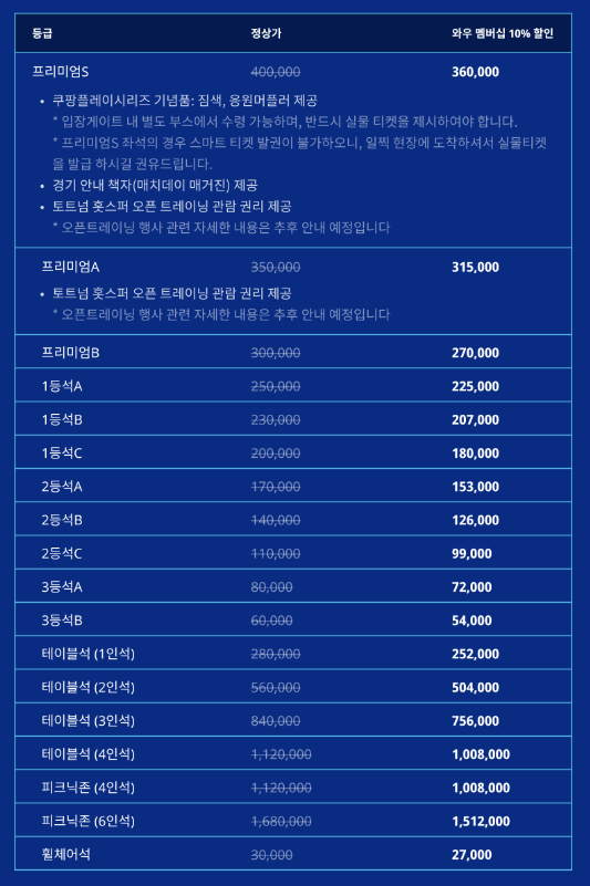 토트넘 내한 경기 예매 역시도 쿠팡플레이를 통해 진행되었습니다. 예매는 7월 13일 경기의 경우 6월 17일 금요일 오후 3시, 7월 16일 경기의 경우 6월 19일 일요일 오후 3시에 시작되었어요.