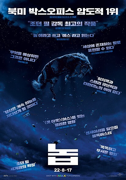 영화 <놉>이 어제인 8월 17일 개봉했습니다. <놉>의 감독은 '조던 필'로, 앞서 <어스>와 <겟아웃> 등을 통해 이름을 알리기도 했었는데요. 이번에 개봉한 영화 <놉> 역시도 조던 필 감독의 신작이라는 이유 만으로 국내 영화 팬들의 기대를 한 몸에 받는 중입니다.