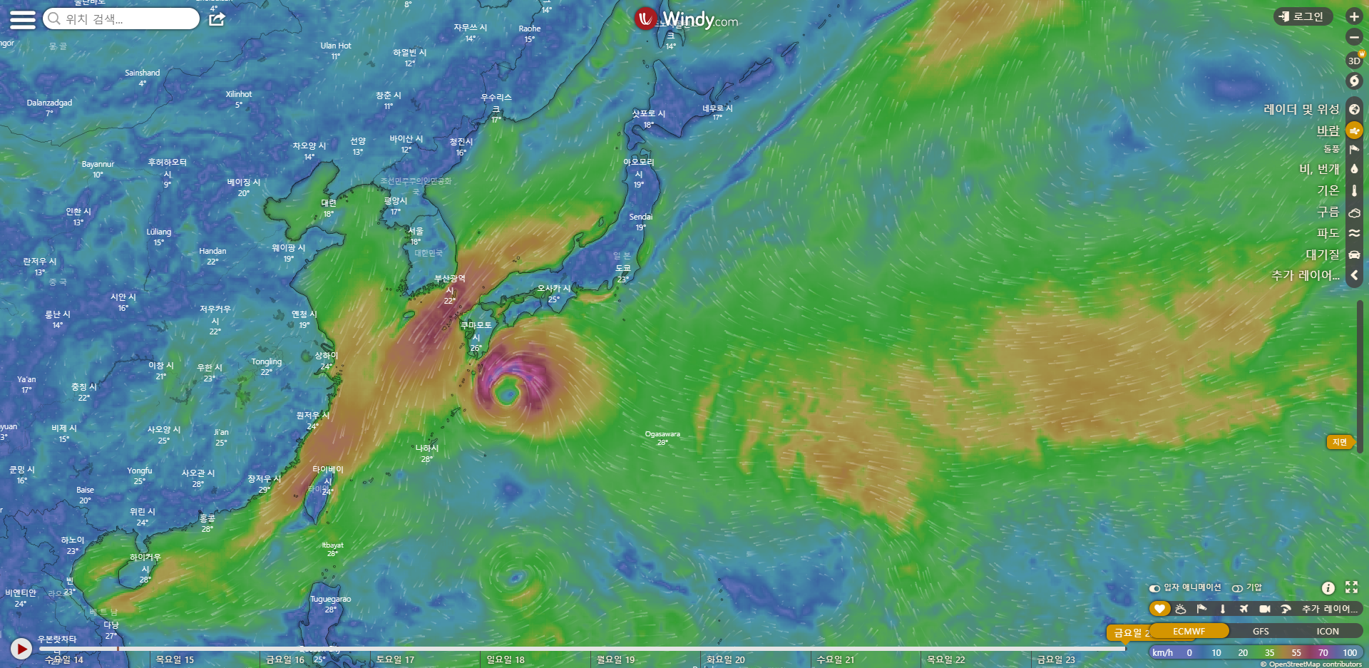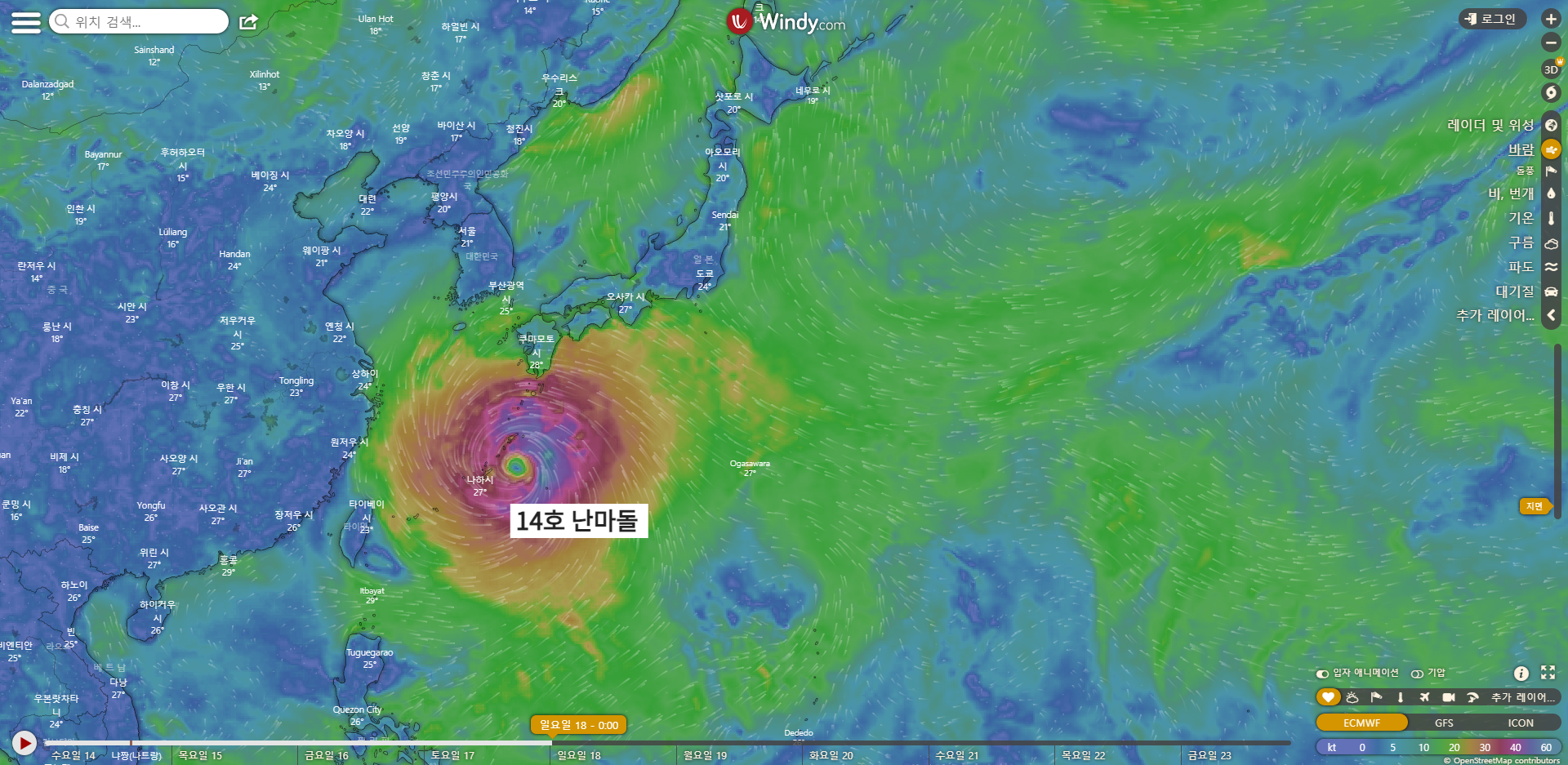 윈디닷컴에서 확인해본 9월 18일 일요일 오전 0시 태풍 예상 경로입니다. 14호 태풍 난마돌이 크기를 키웠고, 전보다 우리나라 쪽으로 이동한 것을 확인할 수 있는데요. 어디까지나 예상 경로이기 때문에 확실한 것은 아니지만, 계속해서 뉴스 소식과 태풍 상황을 확인해볼 필요가 있을 것 같네요.