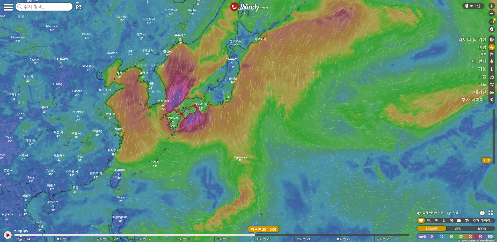 9월 20일 화요일 오전 0시에는 14호 태풍 난마돌이 일본쪽으로 향할 것으로 예상됩니다. 하지만 부산 지역과 매우 근접해있는 것을 확인할 수 있죠? 역시나 부산 지역에 거주하고 계시거나, 방문 계획이 있으신 분들은 대비해주실 필요가 있어요.