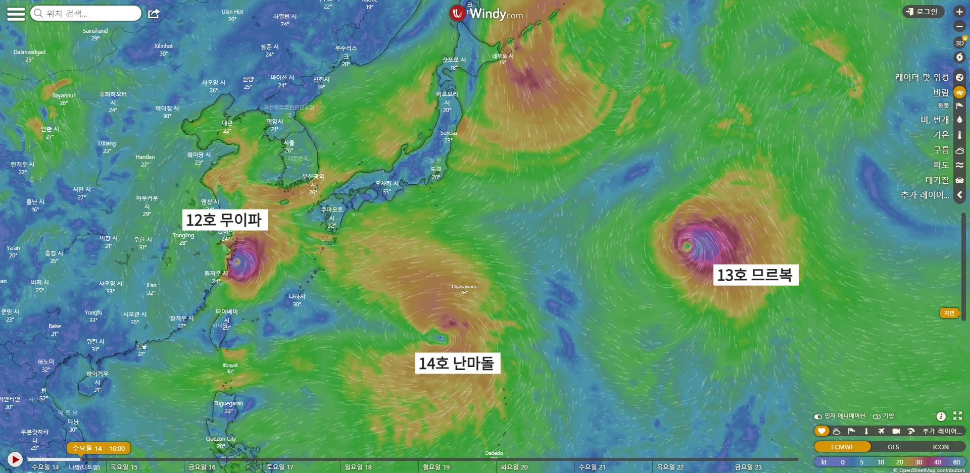 11호 태풍 힌남노가 우리나라 남부지역에 많은 피해를 입힌 후 소멸했습니다. 또한 2호 태풍 무이파, 13호 태풍 므르복, 14호 태풍 난마돌 소식이 전해지면서 태풍에 대한 긴장감을 놓을 수가 없게 되었는데요. 다행히도 12호 태풍 무이파는 현재 중국 쪽을 향했으며 13호 태풍 므르복은 서쪽으로 이동, 우리나라에는 영향을 주지 않을 것으로 예상됩니다.