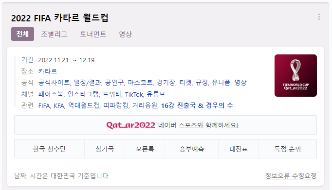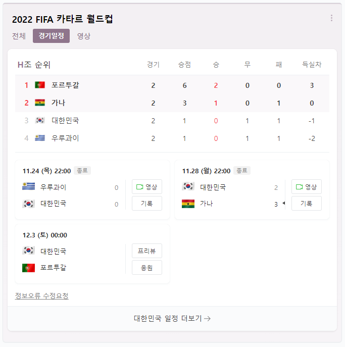 2022 카타르 월드컵이 진행 중입니다. 우리나라는 앞서 있었던 H조 조별리그에서 가나와의 경기는 0:0 무승부, 포르투갈과의 경기에서는 3:2로 패를 했는데요. 우리나라의 승 1무 1패의 결과가 나타나면서 나머지 한 경기에 대한 관심이 매우 높아지고 있습니다.