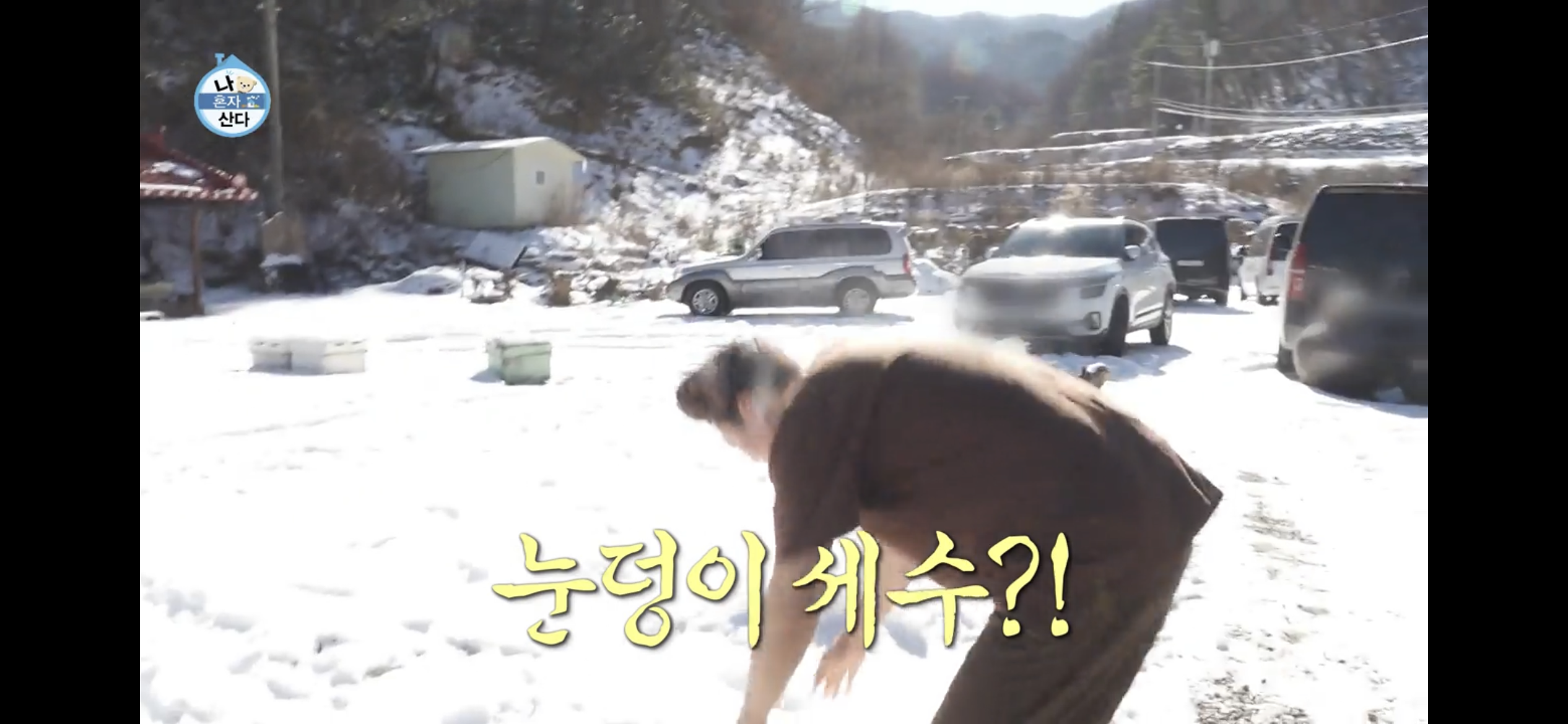 이후 열이 잔뜩 오르자 밖으로 뛰쳐나와 눈으로 세수를 하며 열을 식힌 전현무는 직접 준비한 도시락(?)을 선보였는데요.
