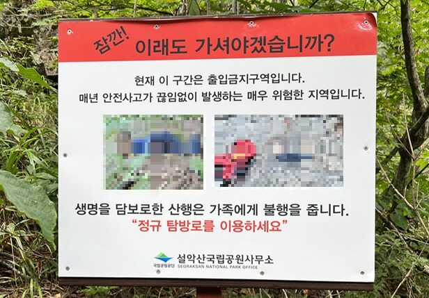 한 등산객은 '해당 경고문이 설악산 곳곳에 설치되어 있었다'며 '해당 구간이 위험해 경고한다는 취지는 알겠지만, 사진의 수위가 너무 높은 게 아닌가 생각했다'라고 밝혔습니다.