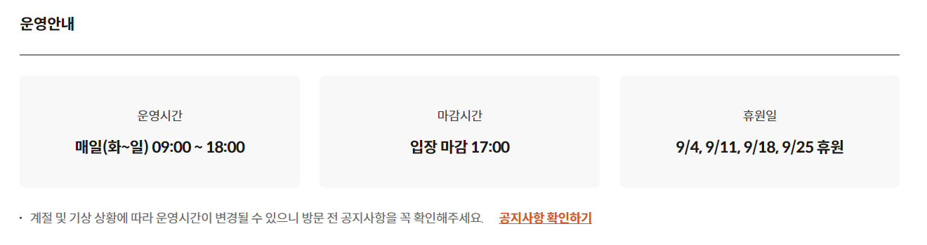 화담숲은 매주 월요일 휴무로, 이용 시간은 매주 화요일과 일요일 오전 9시 ~ 오후 6시 입니다. 입장 마감시간이 오후 5시라고 하니 방문하시는 분들은 여유있게 도착하시는 게 좋겠죠? 2023년 9월 휴무일은 9월 4일, 9월 11일, 9월 18일, 9월 25일 입니다.