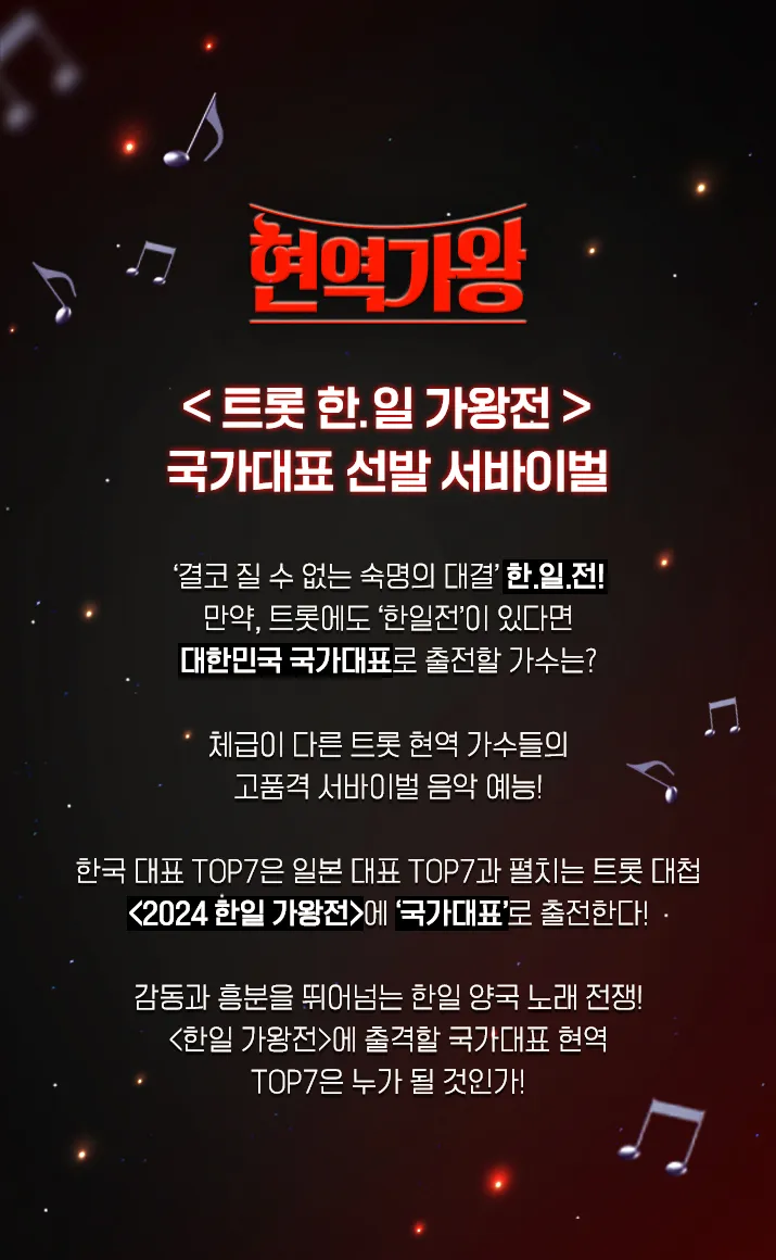 <미스트롯>을 이을 트로트 서바이벌 <현역가왕>이 나왔습니다. 현역가왕은 2024년 치러질 '한일 트롯 가왕전'에 나갈, 대한민국 대표 '최정상급 여성 현역 트롯 가수' TOP7을 뽑는 서바이벌 음악 예능 프로그램인데요. 진행은 신동엽이 맡았으며 매주 화요일 오후 10시에 방영됩니다!