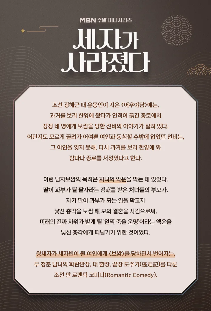 다가오는 4월 13일, MBN 토일드라마 신작 <세자가 사라졌다>가 첫 방영됩니다. <세자가 사라졌다>는 2021년 방영되었던 <보쌈 - 운명을 훔치다>의 스핀오프 작품이라고 하는데요. <보쌈 - 운명을 훔치다> 정보가 궁금하신 분들은 아래의 게시물을 참고해 주시면 될 것 같아요.