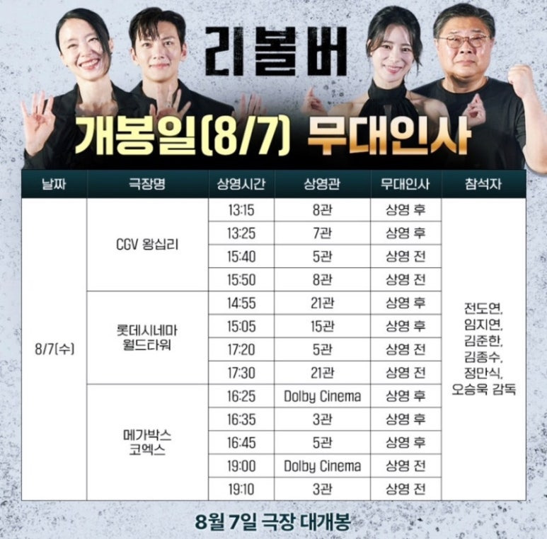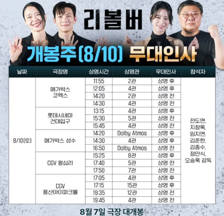 영화 리볼버 무대인가는 개봉일인 8월 7일 수요일을 시작으로 8월 10일 토요일, 8월 11일 일요일까지 총 3일간 진행된다고 하는데요. 전도연, 임지연, 김준한, 김종수, 정만식 배우와 오승욱 감독이 참석할 예정이지만 날짜별로 차이는 있습니다. 총 3일 동안, 14개의 극장에서 48번의 리볼버 무대인사가 있을 예정이니 참고하세요! 아무래도 무대인사 상영회차는 티켓이 빨리 소진되기 때문에, 무대인사에 참석하고 싶은 분들은 빠른 예매하시는 것을 추천드릴게요.