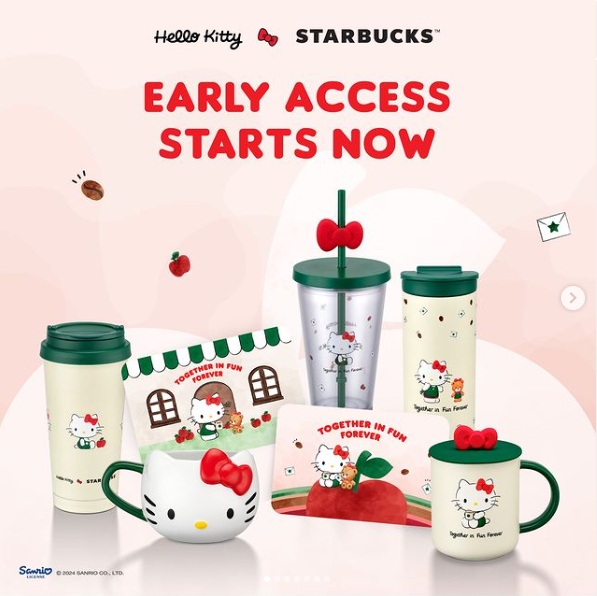 스타벅스 SNS를 통해 알 수 있는 스타벅스 헬로키티 콜라보 제품 굿즈 리스트는 머그컵, 앞치마, 텀블러, 물병, 휴대폰 스트랩, 랜야드, 봉제 인형 등이 있습니다. 한국에는 위의 굿즈 중 4개만 출시할 예정이라고 해요. 과연 어떤 스타벅스 헬로키티 콜라보 제품을 들여올지 매우 궁금합니다.