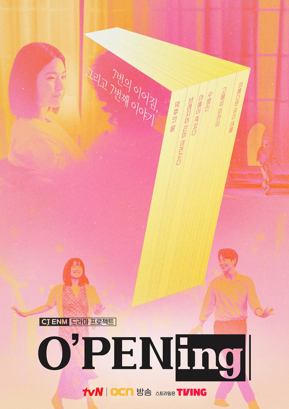 tvN 단막극 프로젝트 오프닝 2024는 자유로운 형식과 참신한 시도가 돋보이는 신인 작가 작품으로 구성된 CJ ENM 드라마 프로젝트입니다. CJ ENM의 오펜(O’PEN) 공모전이 발굴한 개성 넘치는 신인 작가들과 재기 발랄한 신인 연출자들이 만나 소재와 형식의 한계를 뛰어넘어 단막극부터 시리즈까지, 새로운 드라마를 빚어냈다고 하는데요. O’PENing 2024는 '이어짐'에 대한 이야기로 가족, 친구, 이웃, 연인 등 다양한 인물 간의 관계와 이해에 초점을 맞춰 7번의 이어짐을 7가지 이야기에 담아냈다고 합니다.
